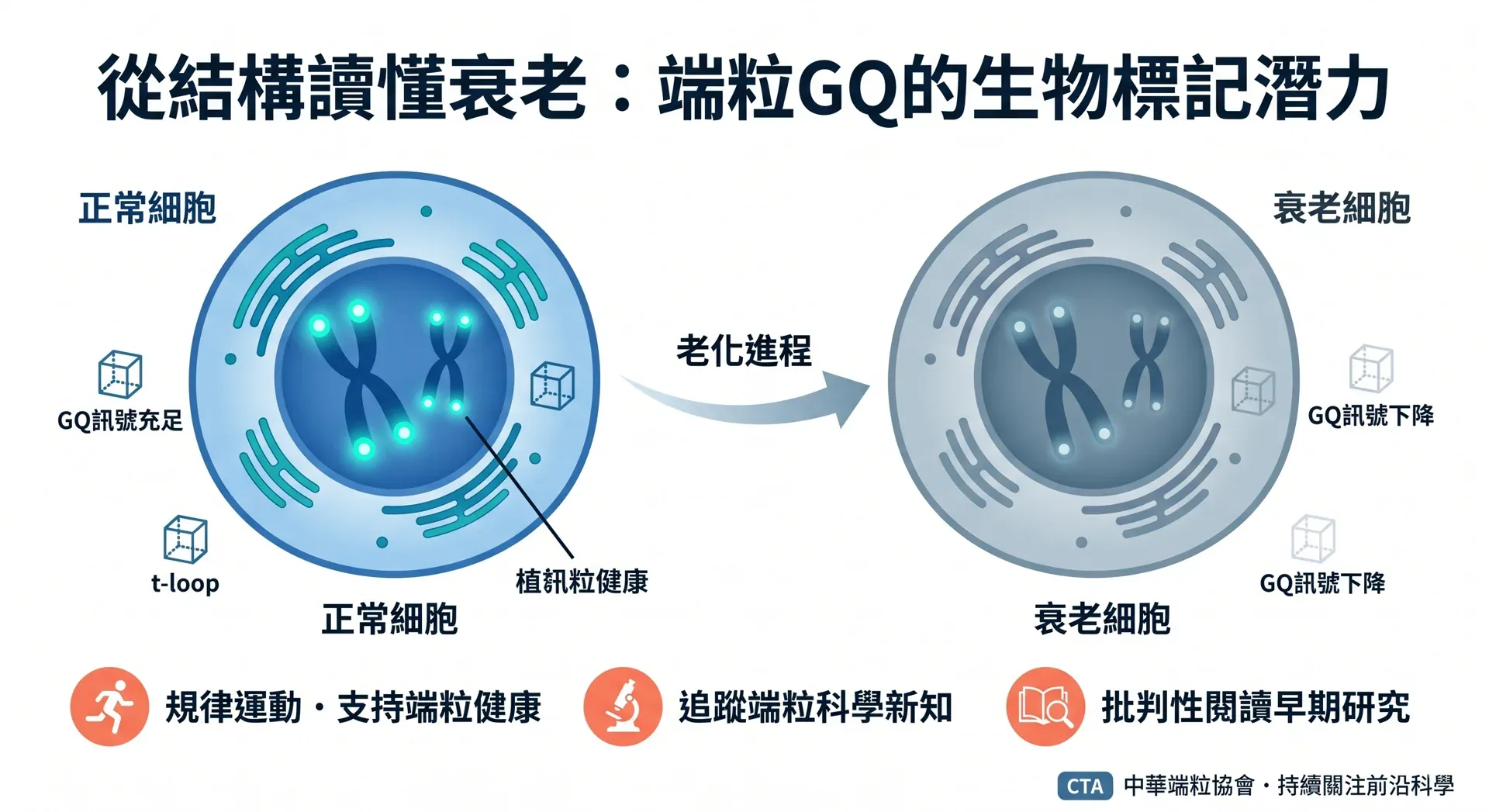 1. 重新理解端粒健康的多維度:端粒的守護不只仰賴足夠的長度,其折疊結構的完整性同等關鍵。保持規律運動、充足睡眠與抗氧化飲食,雖然直接影響GQ結構的機制尚待研究,但對整體端粒健康有正向支持的科學基礎。