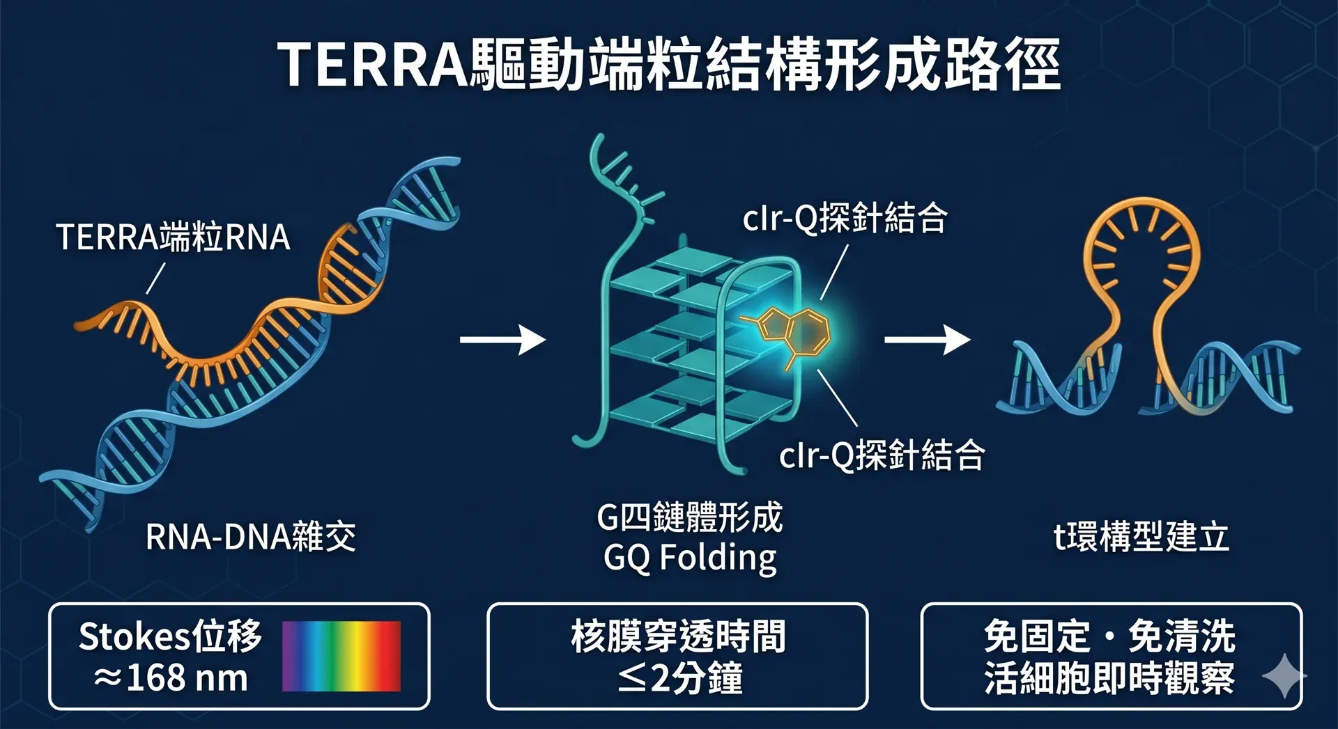 介入措施(I):對活細胞施予cIr-Q探針,搭配超解析度顯微鏡進行端粒結構的原位成像;輔以核磁共振(NMR)光譜及生化分析,解析TERRA(端粒重複序列RNA)所驅動的結構形成路徑。